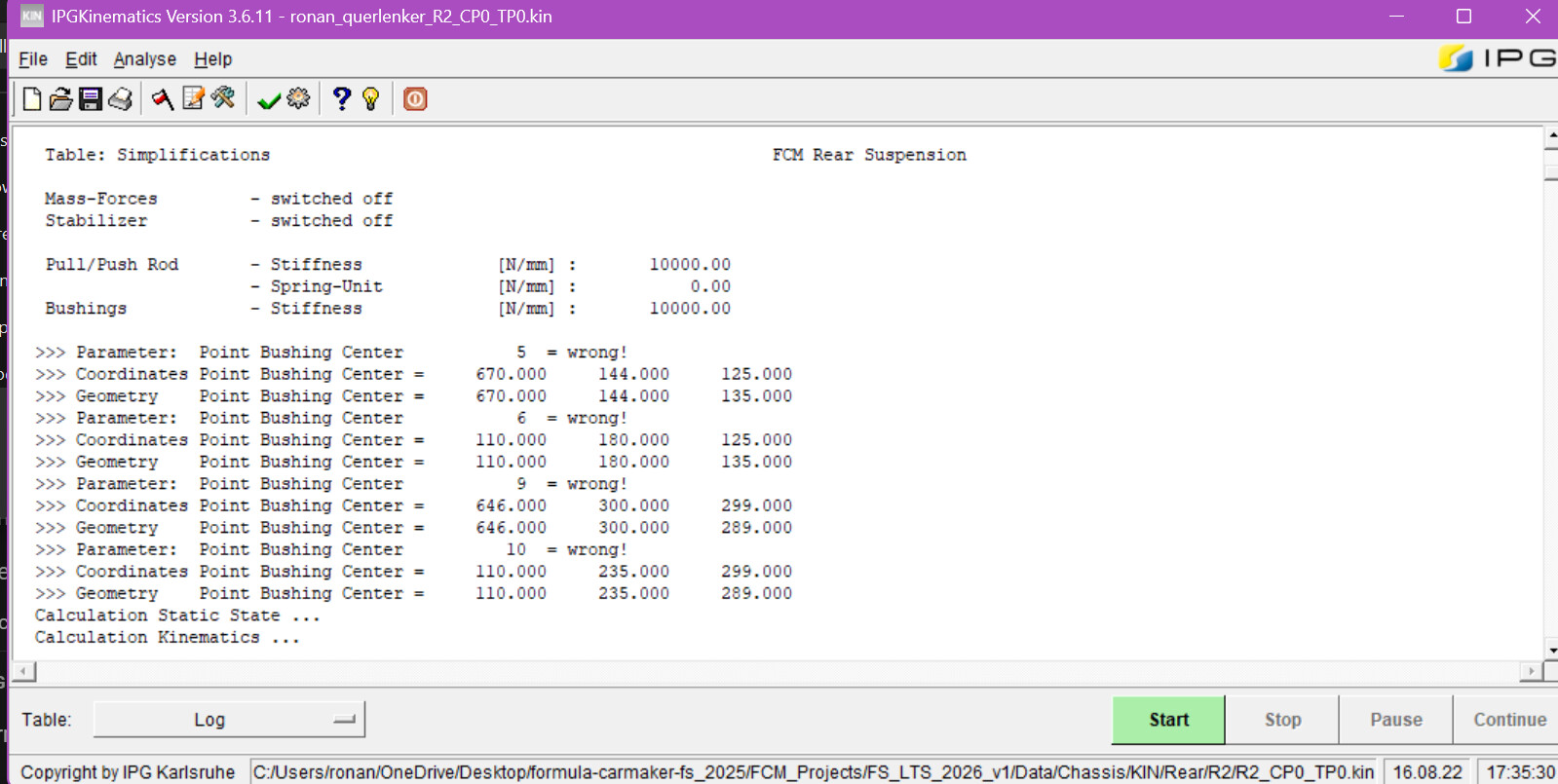 I’m new to Carmaker and have run into some errors that I’d like some help with. I was running IPGKinematics on the rear suspension geometries provided for the LTS 2026 competition and noticed a consistent warning during kinematic simulations (see photo below):