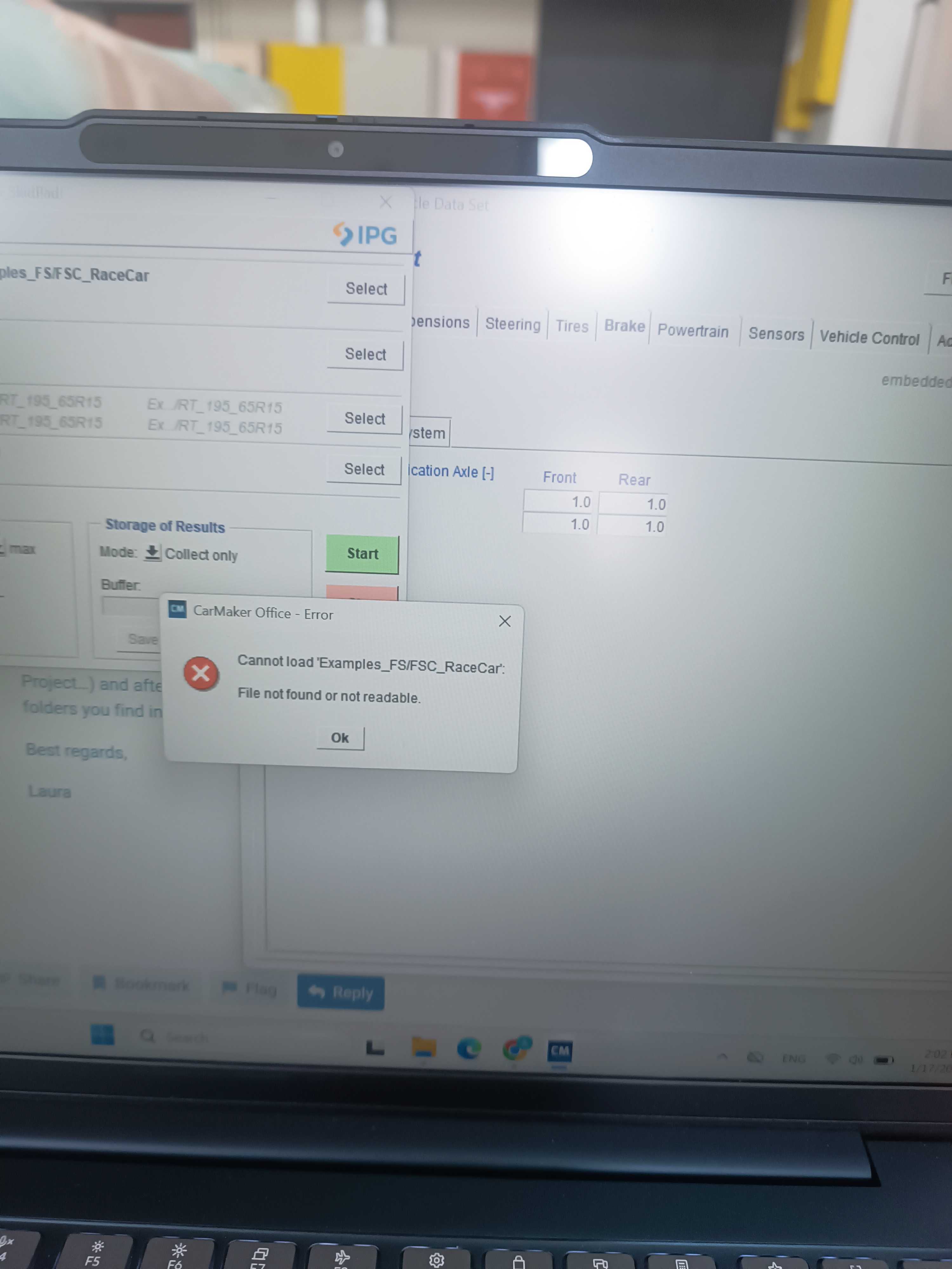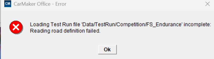 so, first of all I have downloaded the formula_carmaker-fs_2025 from the site. I unzip it (in the downloads) and then I go to the FCM_Projects→Fs_race and copy everything that it is inside this file(src,Data…etc).Then I go to the Main GUI and I create a project (Main GUI > File > Project Directory > Create Project). When the folder is created I go Main GUI > File >Open and in the area where it shows what is inside the folder of the project, I press right click>start file manager and I paste every file that I said before. Then I go again, Main GUI > File >Open and inside the project [Data/TestRun] I go Data>TestRun>Competition>FS_Skidpad and it shows me this error. Also if I try Open FS_Endurance it shows me this error that I show you right here and then again the one that i said the previous time (Examples_FSC_RaceCar….etc).